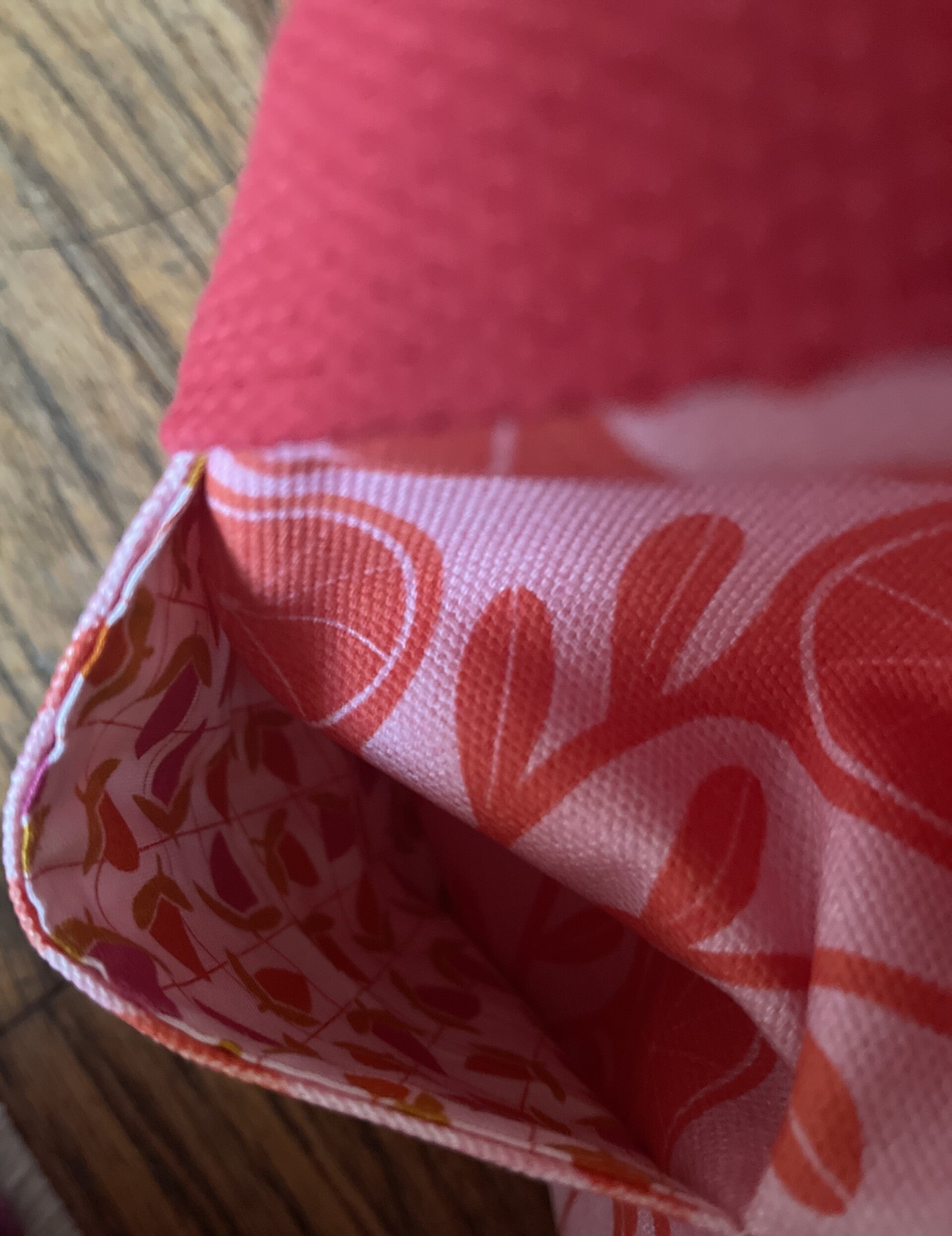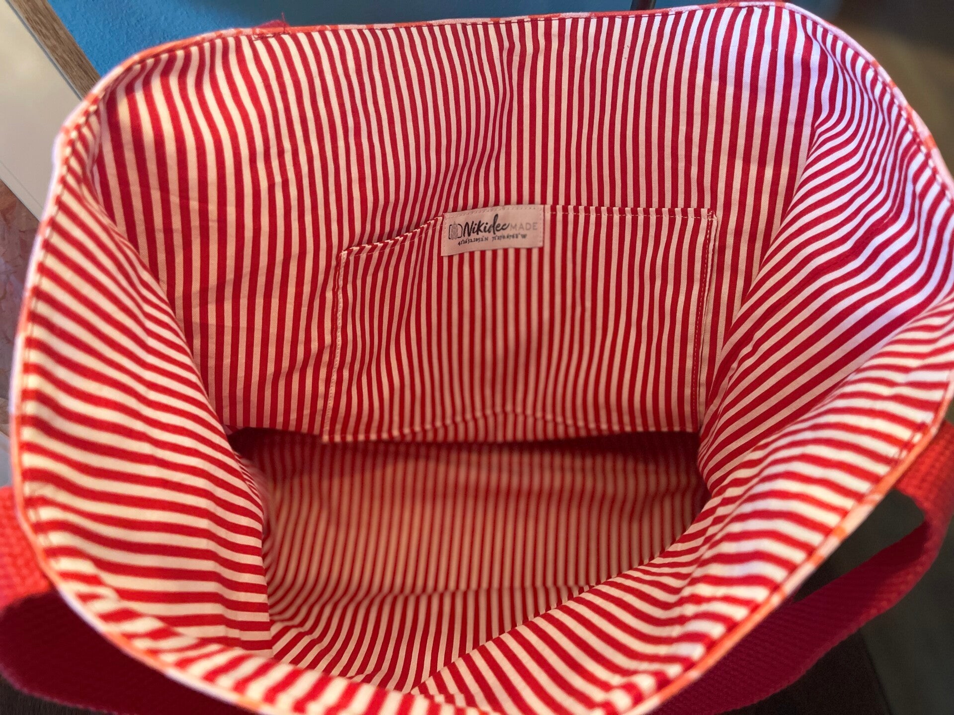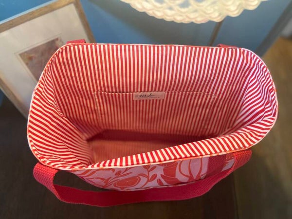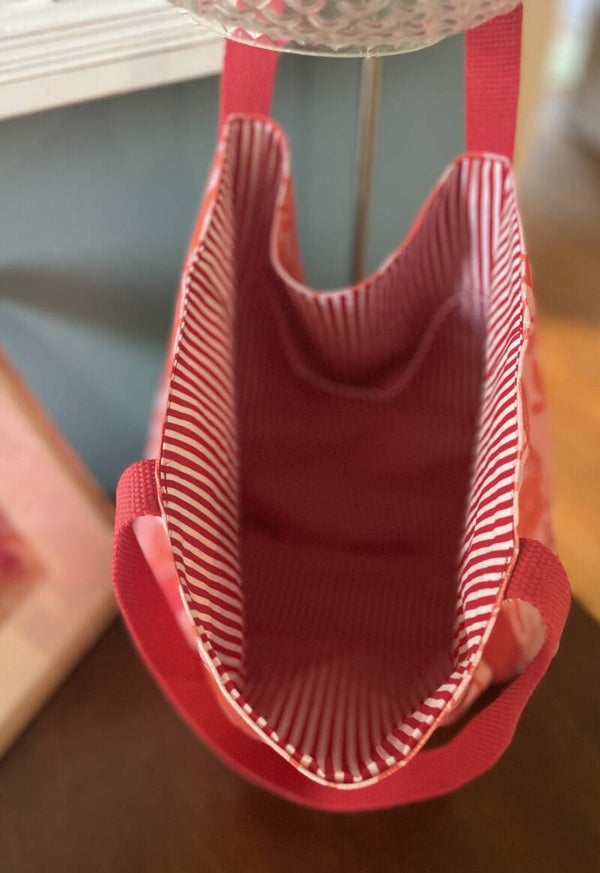 Sturdy red cotton webbing handles run the full length of the bag for extra durability, making this tote perfect for beach days, market runs, or everyday errands.