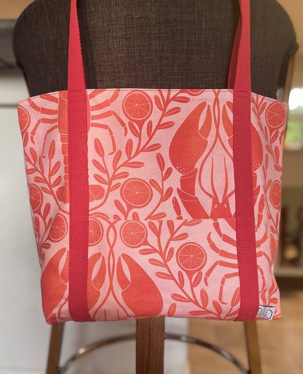 Lobster Lemonade Tote (lined with pockets): approx. 16" H × 18" W with 24" handles, featuring two front exterior pockets and one interior pocket.